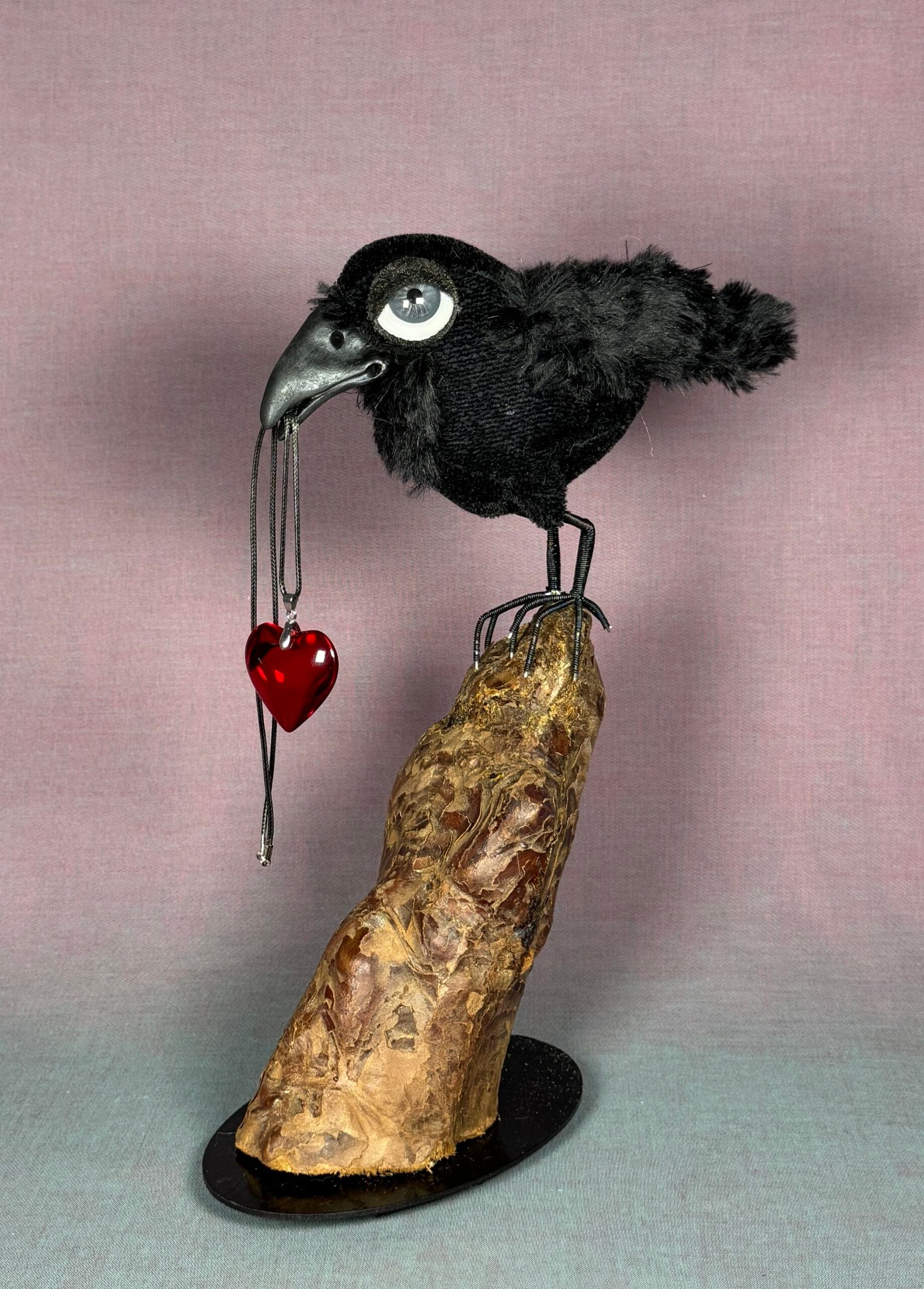 Creighton Crow by Art Rogers Designs, is a one-of-a-kind mixed media sculpture that stands approximately 14 inches tall from the base of his vintage glass Ball Mason jar to the top of his head, Creighton carries a quiet power. From his beak hangs a red glass heart—cor meum—a delicate symbol of devotion. The jar beneath him holds crushed mirror glass, reflecting light in shifting patterns and adding an ethereal layer of meaning and visual texture.