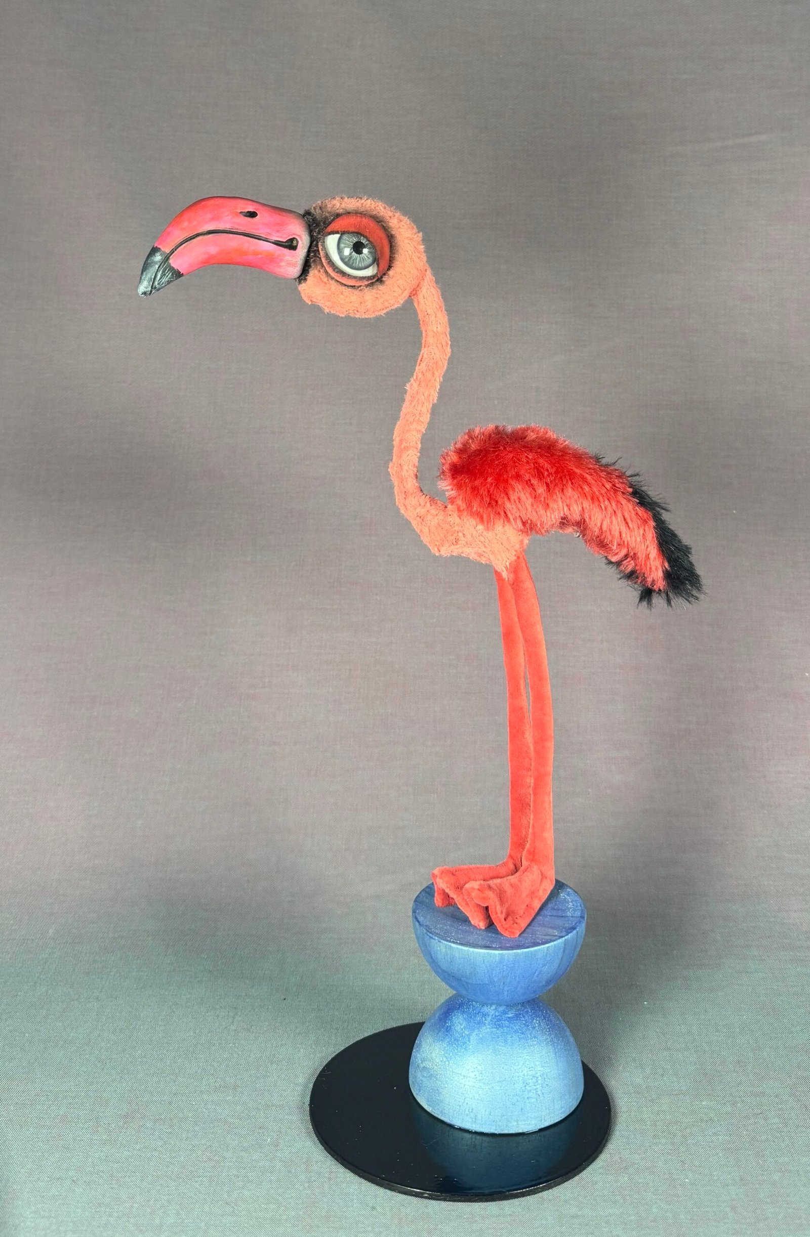 Phlash Flamingo by Art Rogers Designs stands proudly at approximately 16.5 inches tall, 8 inches wide, with a depth of 5 inches. Phlash is securely anchored to his patinaed wood base. He is a whimsical celebration of color, personality, and playful spirit. Phlash is crafted from mohair, viscose, and synthetic fabrics. His wire armature runs from his neck to his feet, which allow for gentle posing, while providing a gracefully arched neck that captures the elegance and humor of this iconic bird. Hand-painted blue glass eyes, sculpted clay beak, airbrushed accents, intricate detailing, and a splash of unexpected flair in his wings make him a show-stopping companion for any collection. With his bold personality and charming stance, Phlash invites smiles, sparks curiosity, and brings a touch of flamboyant fun wherever he lands.