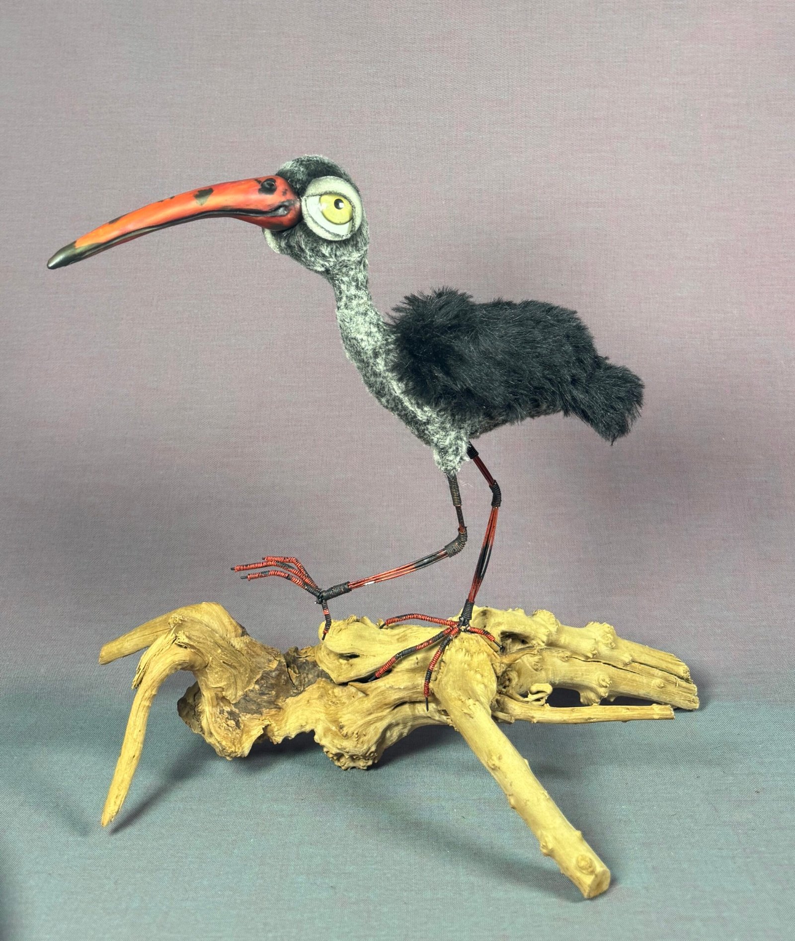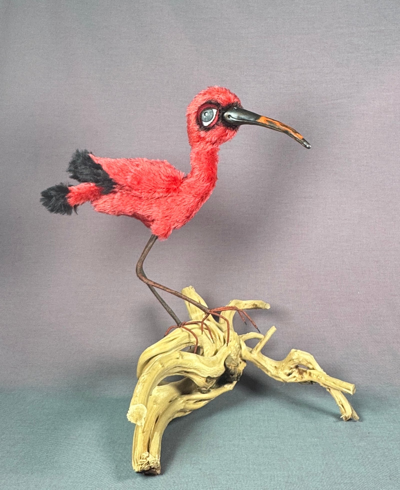 Crimson Ibis by Art Rogers Designs is an elegant and meticulously crafted mixed-media sculpture, standing approximately 17 inches tall from bottom of his driftwood base to the top of his head.. His striking form is brought to life with a carefully curated selection of premium materials—his body and wings sewn from soft mohair, while his eyelids are crafted from synthetic fabric. Crimson’s expressive blue glass eyes are hand-painted, adding depth and character, while his sculpted clay beak showcases intricate hand-painted detailing. Wire legs and feet provide stability, and subtle airbrushed accents enhance his lifelike presence, making him a stunning and unique collectible.