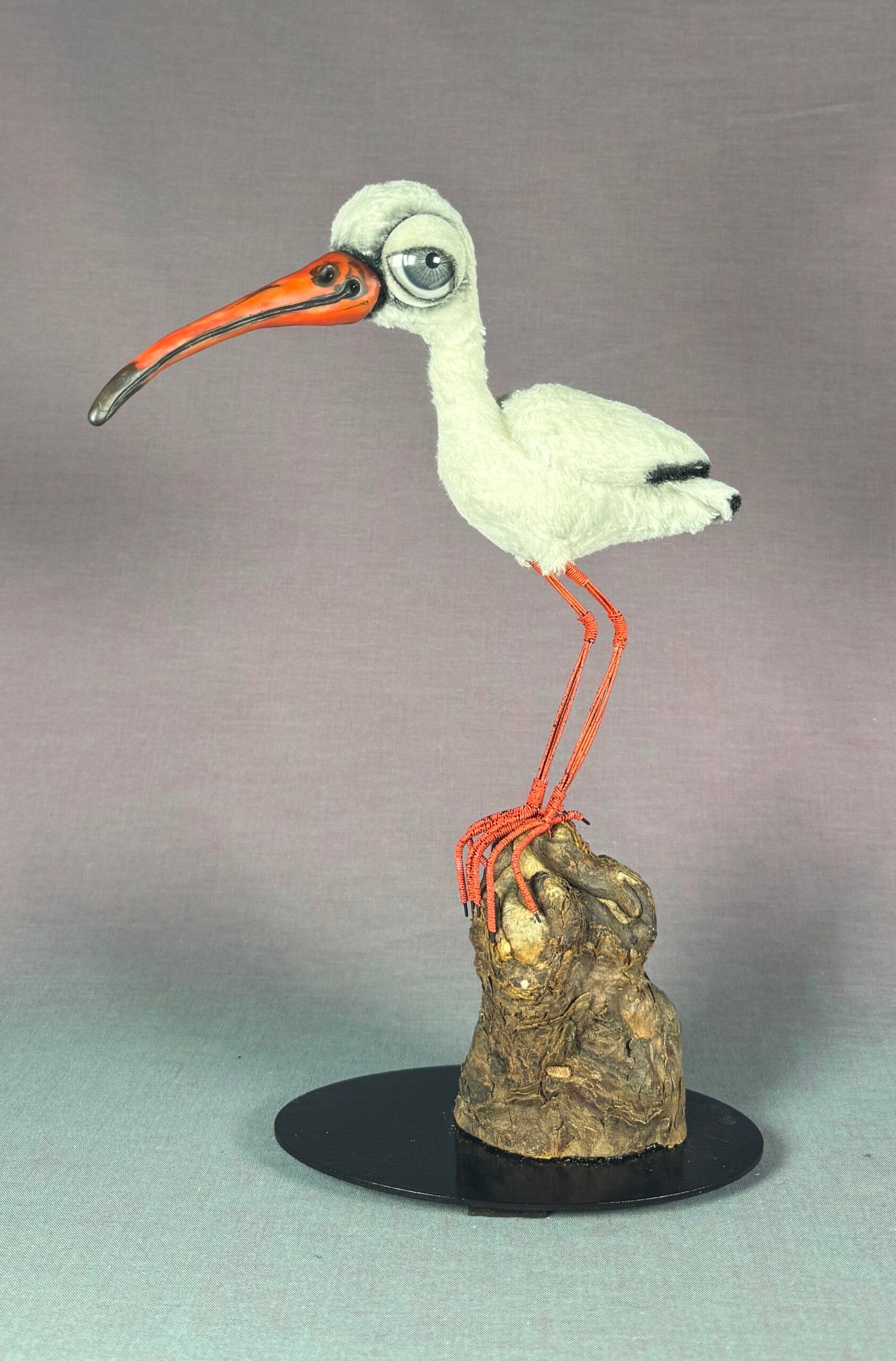 Iggy Ibis by Art Rogers Designs is an elegant and meticulously crafted mixed-media sculpture, standing approximately 14 inches tall from bottom of his cypress knee wood base to the top of his head.. His striking form is brought to life with a carefully curated selection of premium materials—his body and wings sewn from soft viscose, while his eyelids are crafted from synthetic fabric. Iggy’s expressive blue glass eyes are hand-painted, adding depth and character, while his sculpted clay beak showcases intricate hand-painted detailing. Wire legs and feet provide stability, and subtle airbrushed accents enhance his lifelike presence, making him a stunning and unique collectible.
