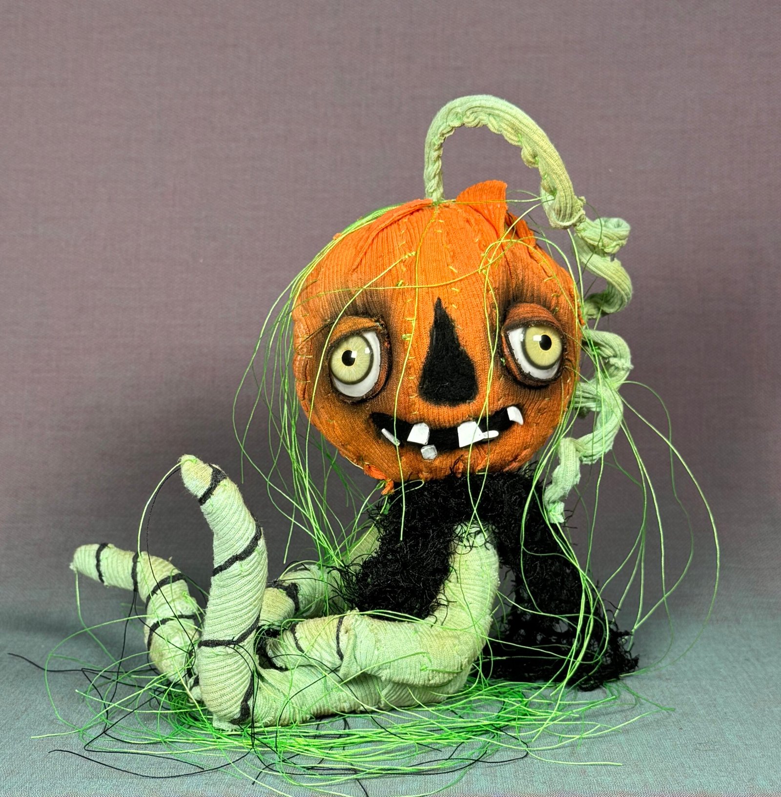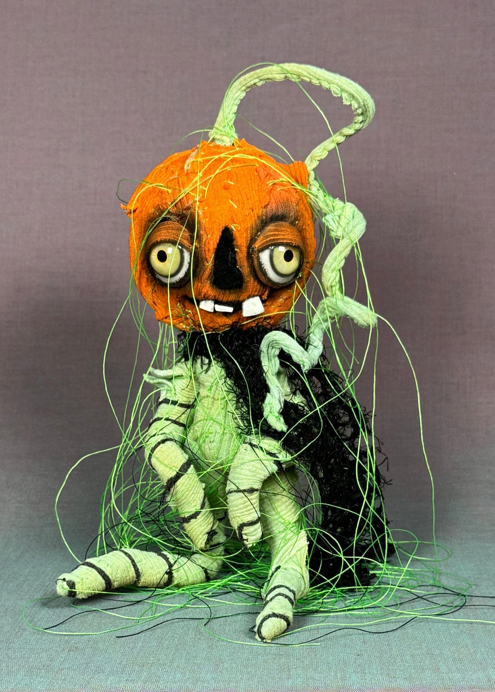 Whether displayed as a seasonal favorite or a year-round oddity, Jack o’-Pumpkin-Head is a captivating character full of quirky charisma. Both playful and macabre, he is a distinctive addition to any art doll or soft sculpture collection—an evocative piece that celebrates seasonal folklore through fine textile artistry.