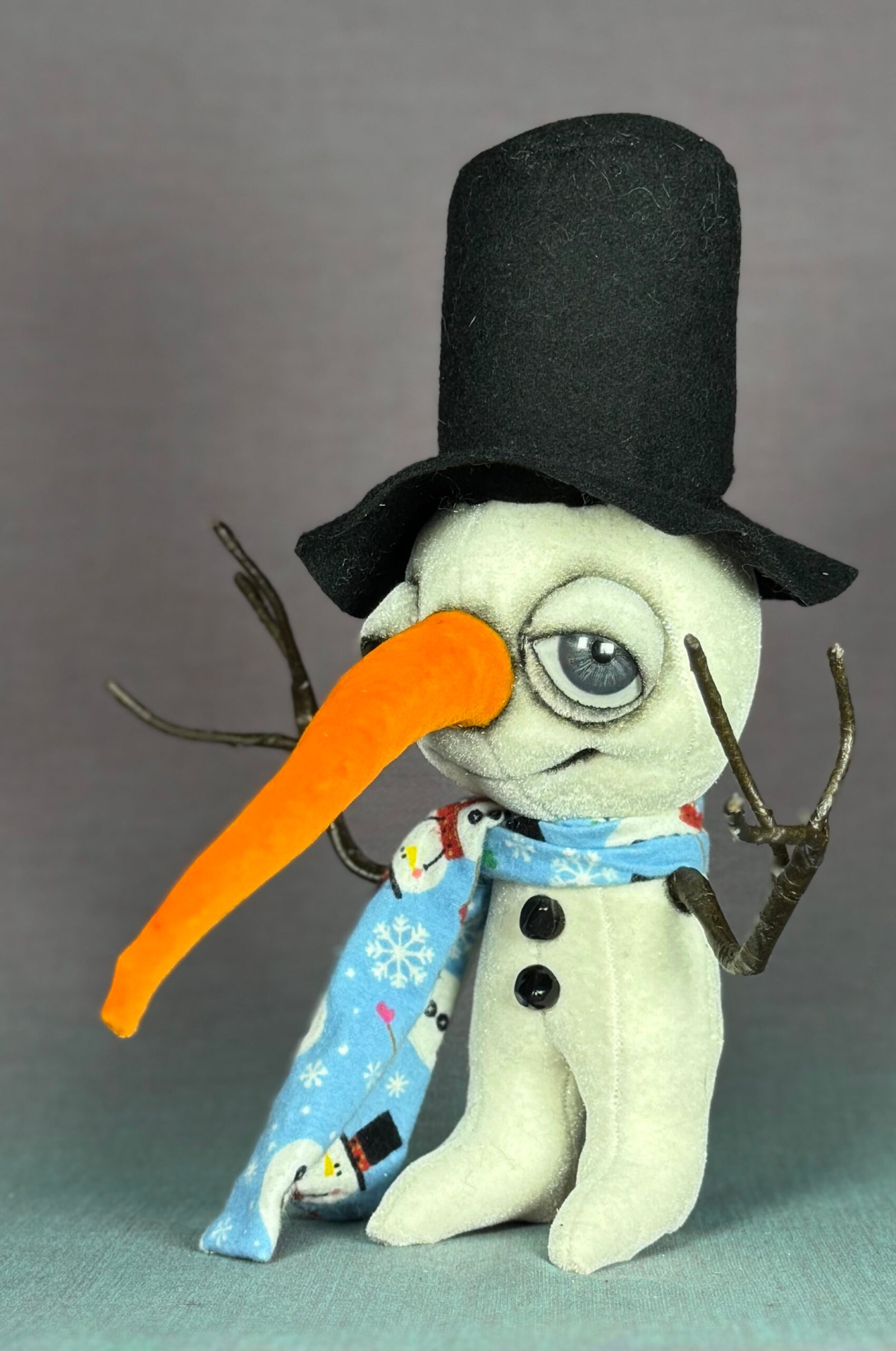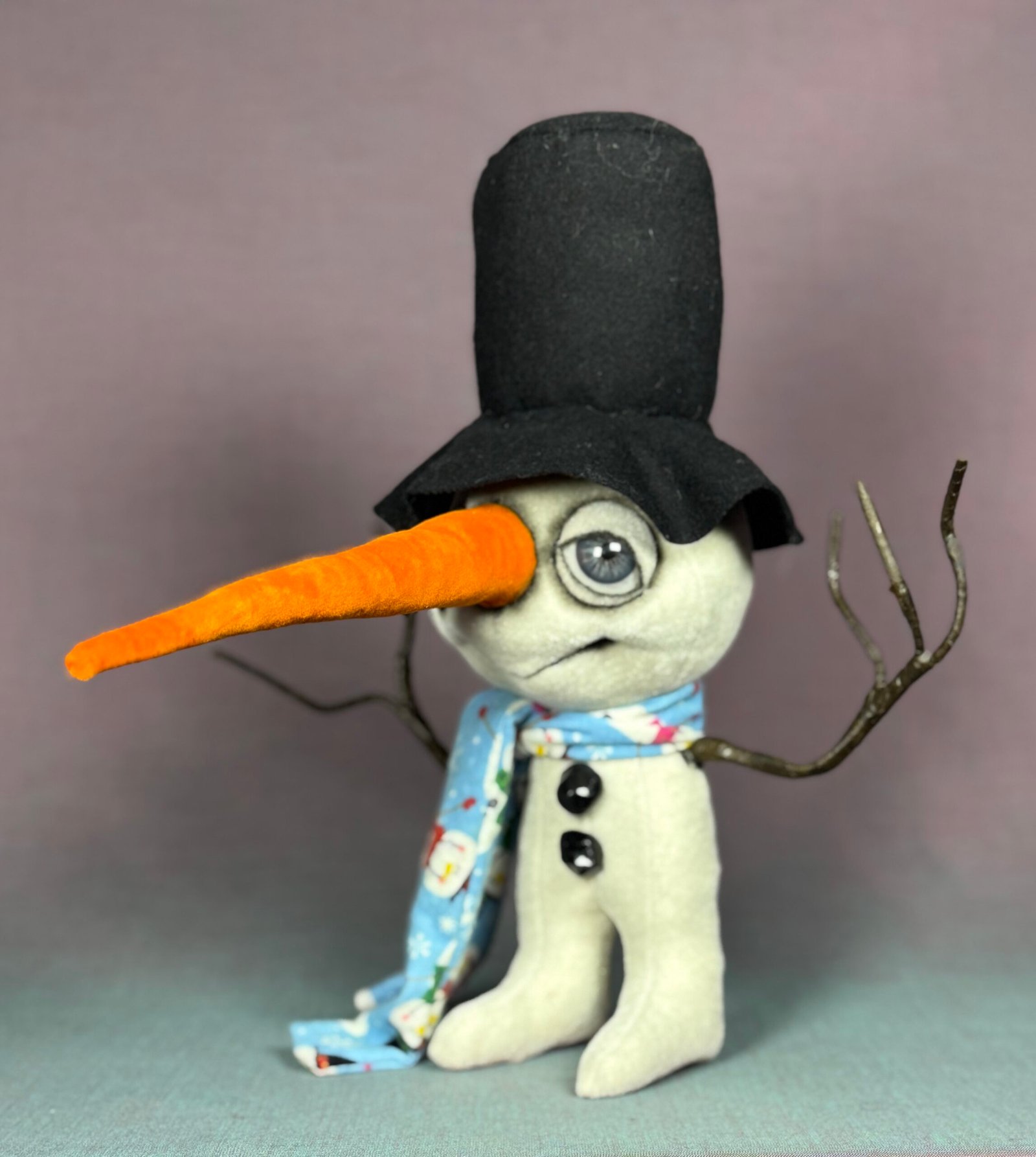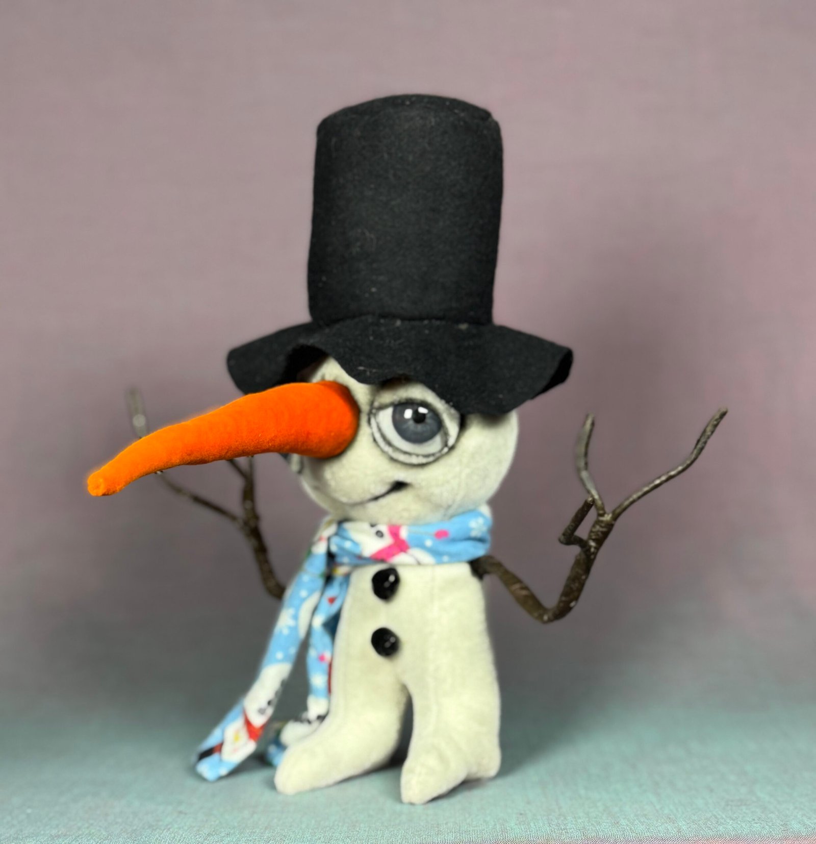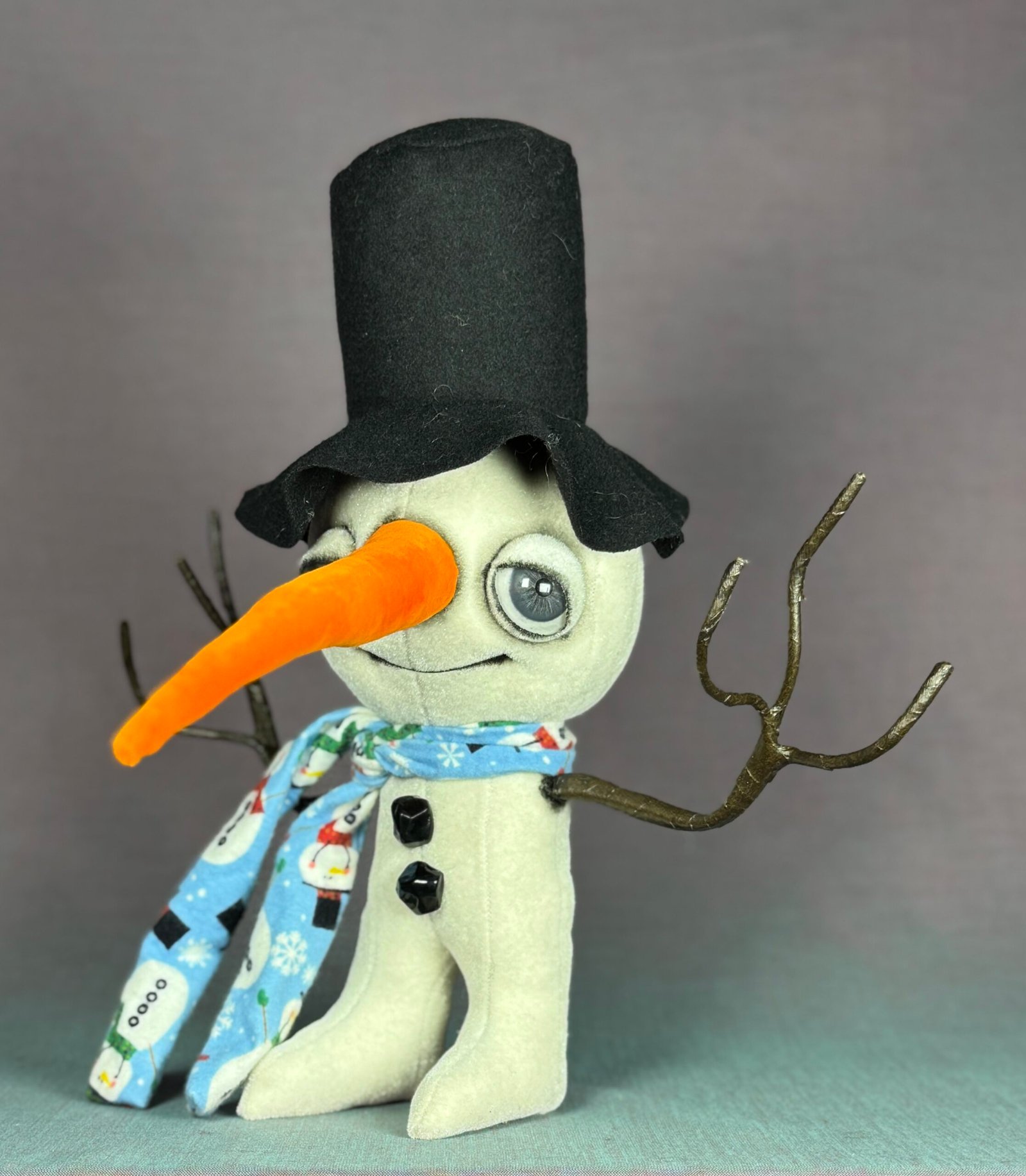 Winterton the Snowman by Art Rogers Designs stands 10 inches tall (including his jaunty, non-removable stovepipe hat). He is sewn from soft synthetic fabric and features a long carrot-style nose of orange synthetic fabric. His twig-like arms are crafted with wire armature for shaping, and a jointed neck adds a touch of expressive charm. Hand-painted blue glass eyes, clay “coal” buttons, and subtle airbrushed accents bring him vividly to life. A cozy cotton fleece scarf printed with playful snowmen completes the look, making Winterton a whimsical and heartwarming winter companion.