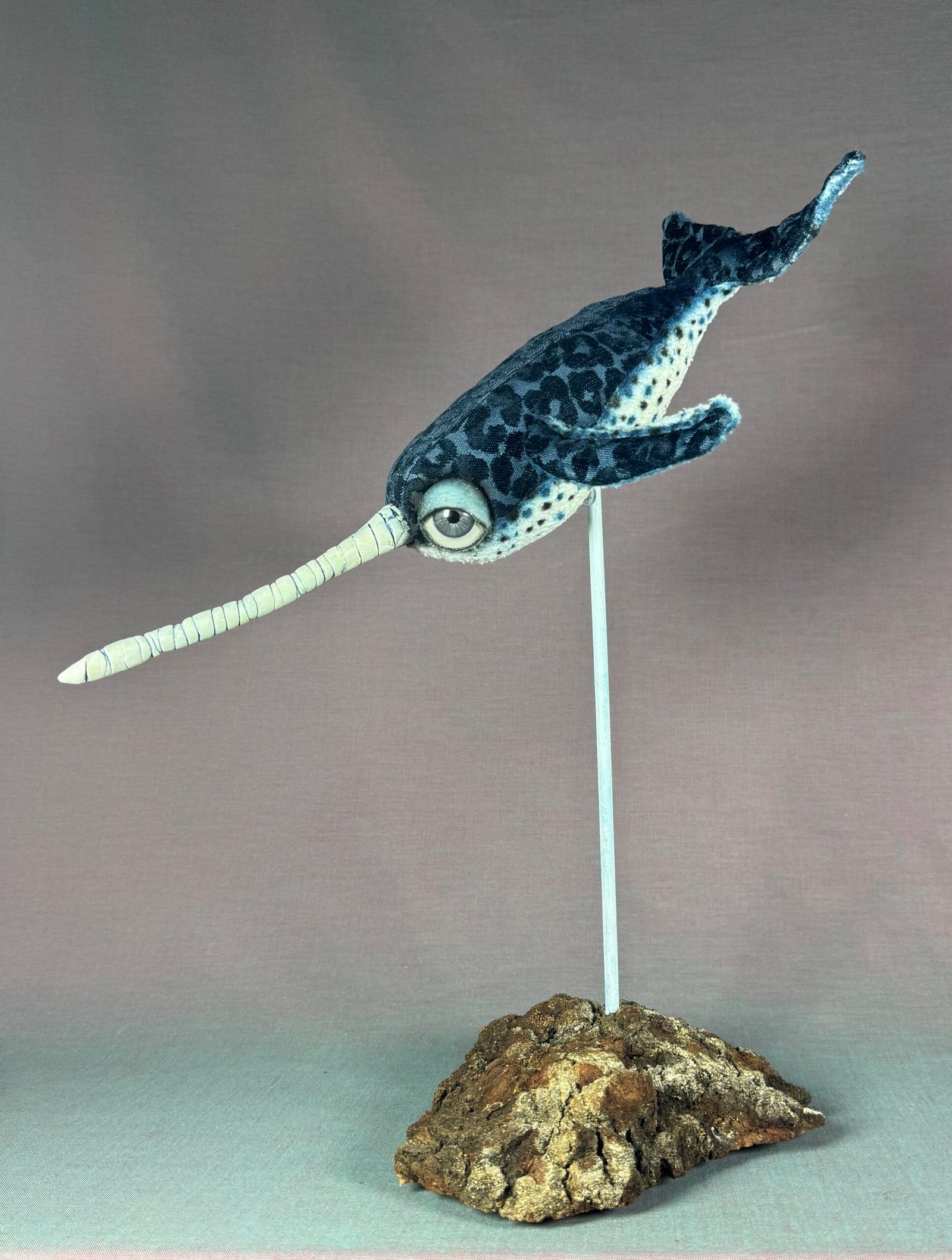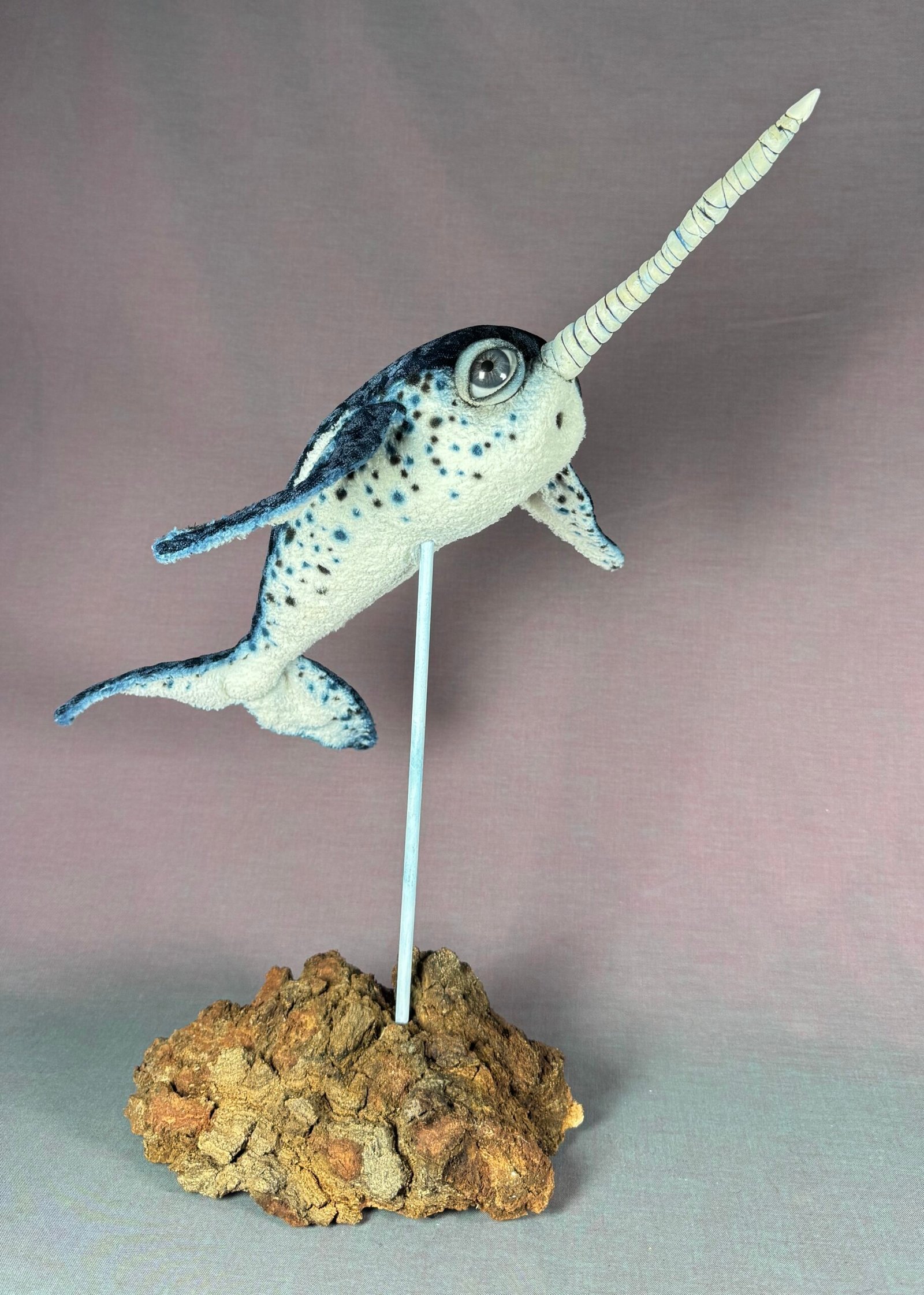 Nereus Narwhal by Art Rogers Designs stands proudly on his natural wood pedestal, measuring approximately 19.5 inches tall from his wood base to the tip of his tusk, 14 inches wide, and 12 inches deep. He is meticulously handcrafted from vintage upholstery and viscose fabrics, giving him both texture and character. His sculpted clay tusk adds striking detail, while his hand-painted blue eyes and gentle airbrushed accents bring warmth and lifelike expression to this whimsical sea traveler.