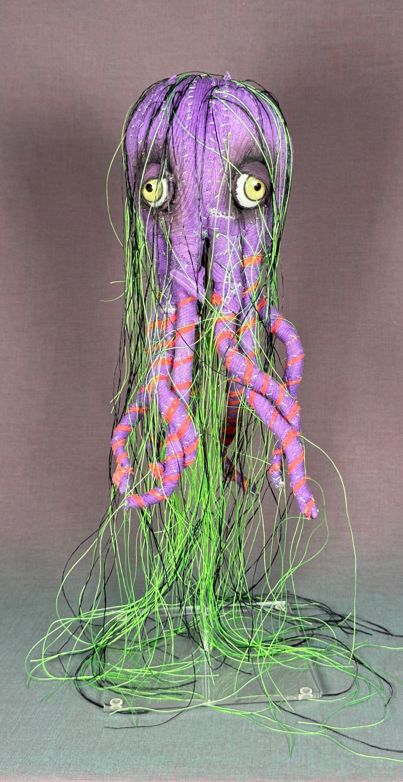 Oskar Octopus by Art Rogers Designs is 10 inches in height and rests on his acrylic stand, that highlights his eight graceful intertwined tentacles and wispy strands of string cascading from the top of his head and drape loosely at the base of his stand. Oskar is crafted entirely by hand from a soft synthetic fabric. The textured fabric is highly embellished with detailed stitching that adds dimension to his free-flowing form. HIs green hand-painted glass eyes have delicate airbrushing to bring them to focus.
