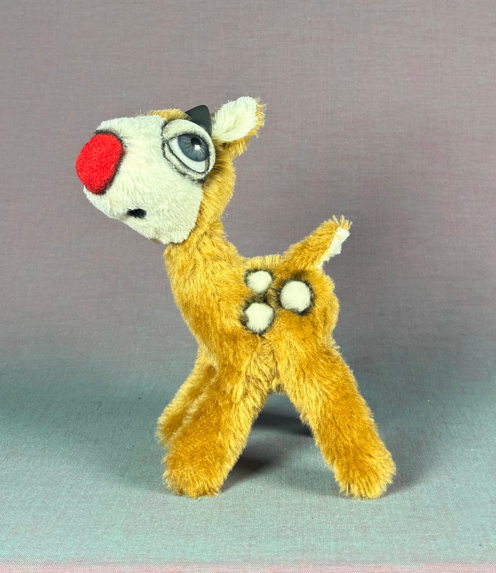 Rudy Reindeer by Art Rogers Designs stands 8 inches tall, is jointed at the neck and features a wire armature for extra support and pose-ability, made from white and warm brown synthetic fabric with little antlers hand-sculpted from polymer clay. Rudy has a red needle felted wool nose, sparkling blue hand-painted glass eyes, and airbrushed details.
