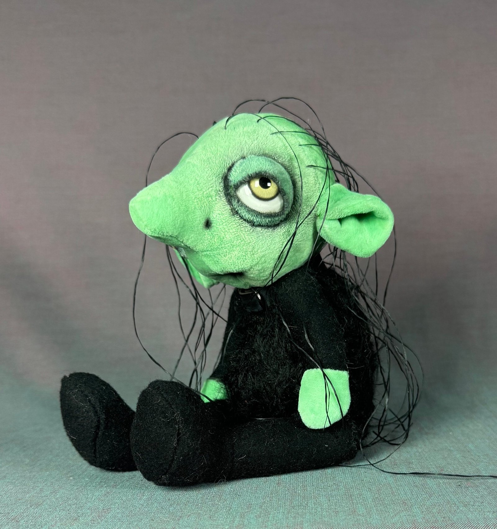 Handcrafted from cotton fabric and filled with soft fiberfill, his mummy-like hand-stitched body wraps around an internal wire armature that adds flexibility and structure. Peter is designed to stand or sit, measures 10 inches tall, Peter features 5-way cotter pin joints at the neck, shoulders, and hips, allowing for delightfully expressive poses. His vivid green hand-painted glass eyes seem to follow you, his teeth are sculpted from clay, while subtle airbrushed accents bring out the depth and texture of his carefully hand-stitched, wrapped form.