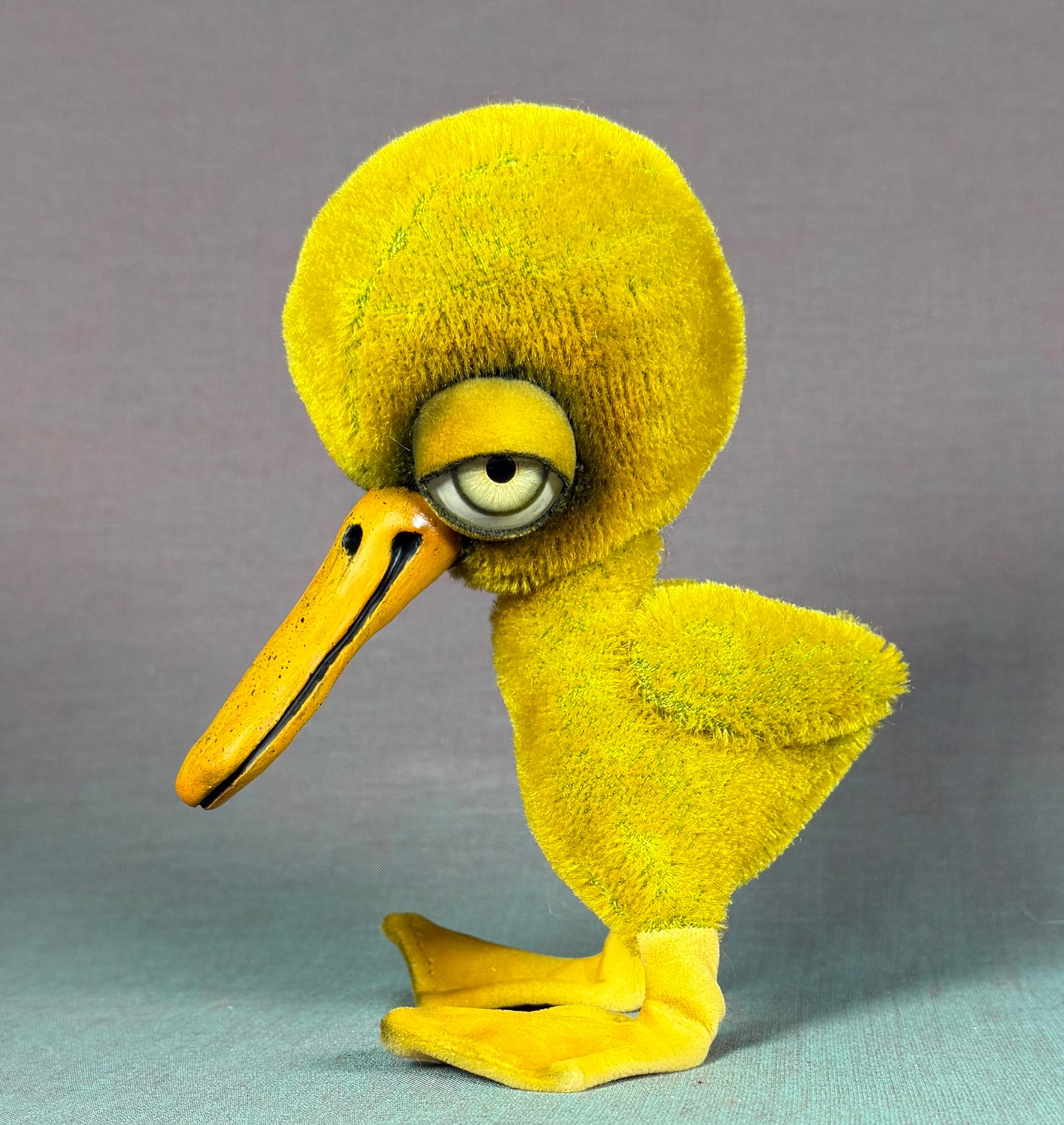 His expressive green hand-painted glass eyes, along with his painted polymer clay bill and feet, are accented with gentle airbrushed shading that brings warmth and life to his features. A wire armature in his neck allows for graceful, playful posing — because a pelican with this much charm deserves to strike a pose or two.