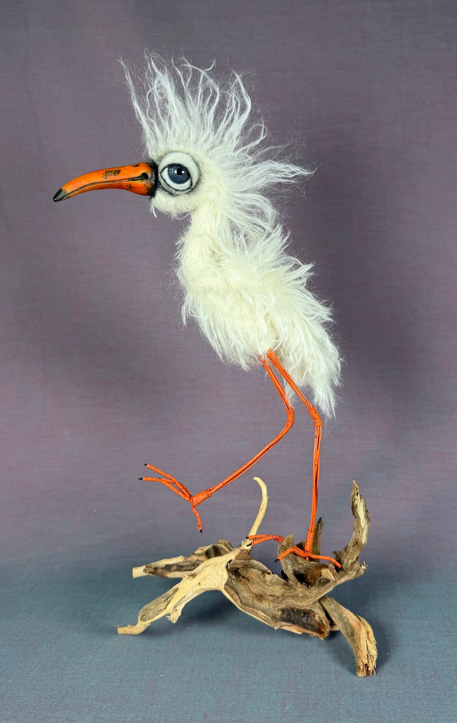 Hugo Heron by Art Rogers Designs is an elegant and meticulously crafted mixed-media sculpture, standing approximately 16 inches tall from the base of his driftwood base to the tip of his crest. His striking form is brought to life with a carefully curated selection of premium materials—his body, wings and crest are sewn from soft mohair, and complemented by finely detailed synthetic eyelids. Hugo’s sparkling blue glass eyes are hand-painted, adding depth and character, while his sculpted clay beak showcases intricate hand-painted detailing. Wire legs and feet provide stability, and subtle airbrushed accents enhance his lifelike presence, making him a stunning and unique collectible.