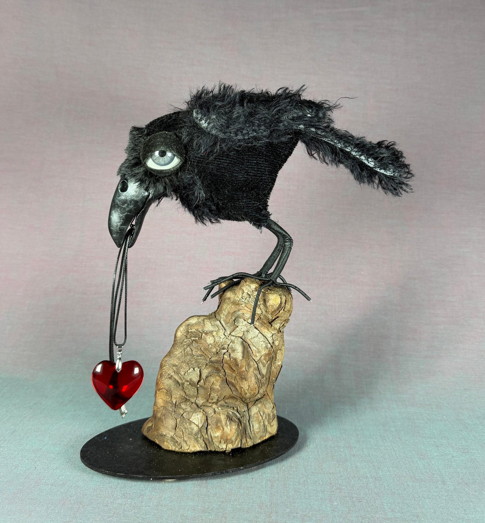 Corwin Crow by Art Rogers Designs, is a one-of-a-kind mixed media sculpture that stands approximately 14 inches tall from the base of his vintage glass Ball Mason jar to the top of his head, Corwin carries a quiet power. From his beak hangs a red glass heart—cor meum—a delicate symbol of devotion. The jar beneath him holds crushed mirror glass, reflecting light in shifting patterns and adding an ethereal layer of meaning and visual texture.