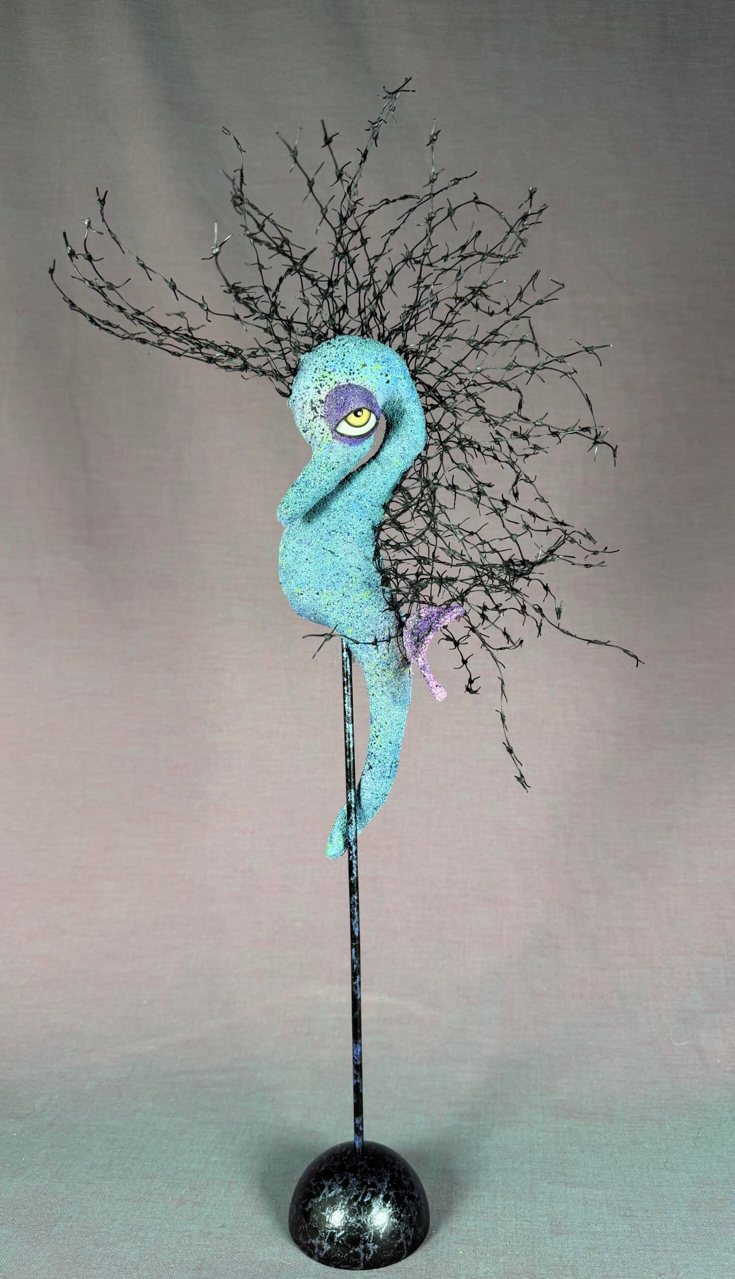 Handcrafted from canvas and brought to life with layered acrylic paint techniques, Tatsu shimmers with depth and character. His distinctive mane is fashioned from extruded plastic mesh, giving him a touch of whimsy and motion, while his sparkling blue, hand-painted glass eyes seem to hold a glint of the sea itself.